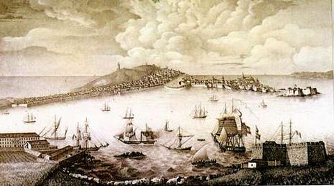 El puerto de A Coruña a comienzos del siglo XIX, según un grabado de Enrique Luard, y sello uruguayo conmemorativo de los correos marítimos | archivo